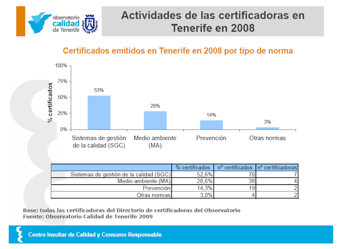 Porcentaje de certificados emitidos en Tenerife por tipo de norma, según los datos del estudio del Directorio de certificadoras del Observatorio de Calidad de Tenerife.