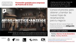 El Consorcio de Rehabilitación Puerto de la Cruz, en colaboración con el Cabildo de Tenerife, el Observatorio de la Calidad de Tenerife (OCATEN), Comercio de Tenerife, el Centro Insular de Calidad y Consumo Responsable del Cabildo de Tenerife y la Concejalía de Comercio de Puerto de la Cruz, organiza una formación el próximo martes 10 de diciembre de 13:15h a 14:15h, denominada "Conoce el proceso para obtener y tramitar las nuevas hojas de reclamaciones para tu negocio".